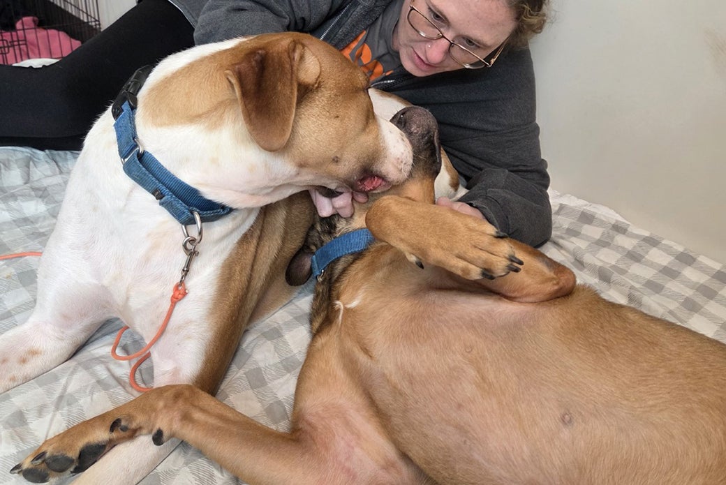When Robert first arrived at the Behavioral Rehabilitation Center, he was a very fearful pup. Since graduating from our program, he has blossomed into a resilient, gentle dog who is ready to take on the world, one cozy nap and silly play session at a time. With other dogs, he is respectful and responsive and enjoys friendly play sessions. With people, he warms up at his own pace, but once you’re in his circle, expect tail wags, goofy play and quiet couch cuddles.