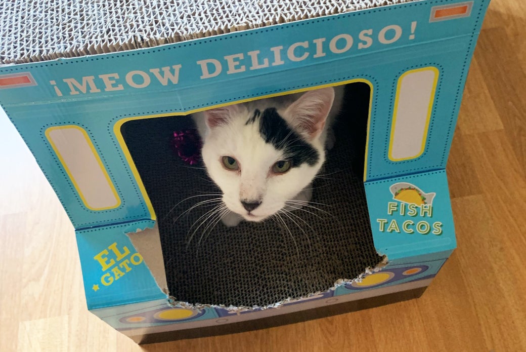 Fray can be a little shy when meeting new people but comes around quickly, especially if you have treats! He loves to play with string toys and bat around mouse toys or pieces of paper. He absolutely loves his cardboard scratchers!
