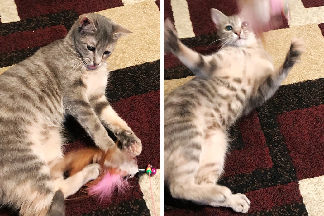 Pretty Kitty definitely lives up to her name! This gorgeous gal can be a bit shy at first and needs some time to warm up to new people and new places. Once she settles in, Pretty Kitty likes to explore and loves to play! Her favorite toys are laser pointers, small balls, and anything dangling she can bat around. Pretty Kitty enjoys being brushed, and when she's comfortable she likes to stay by your side and lounge in bed with you. She can be active at night and early in the morning, so it may be best to tire her out before bedtime with lots of playtime! Pretty Kitty may do well in a home with other cats as long as they were introduced slowly.