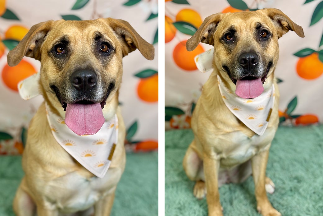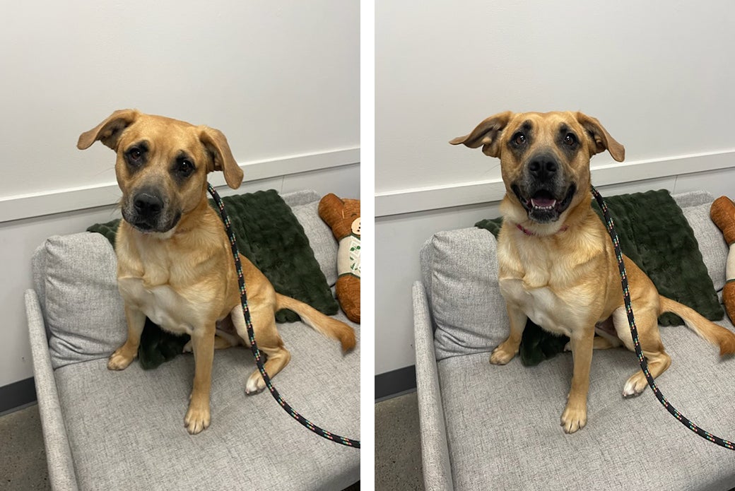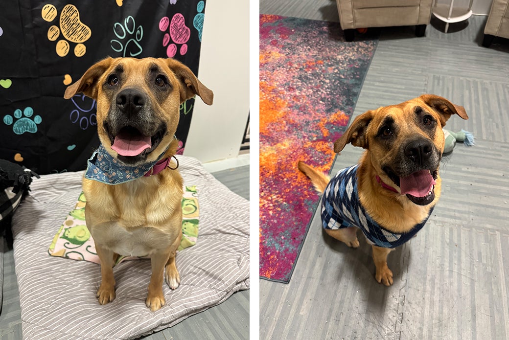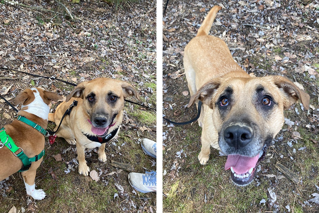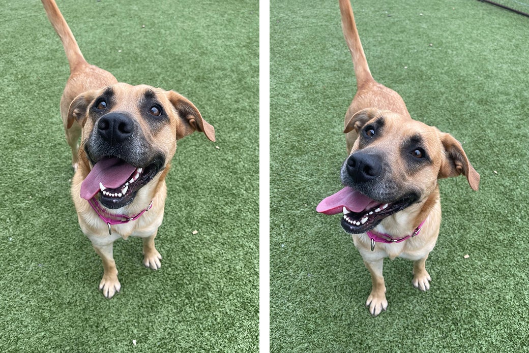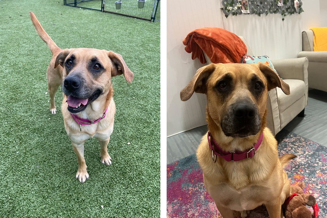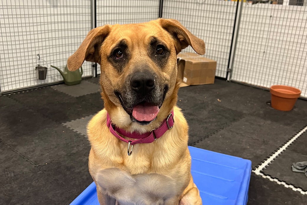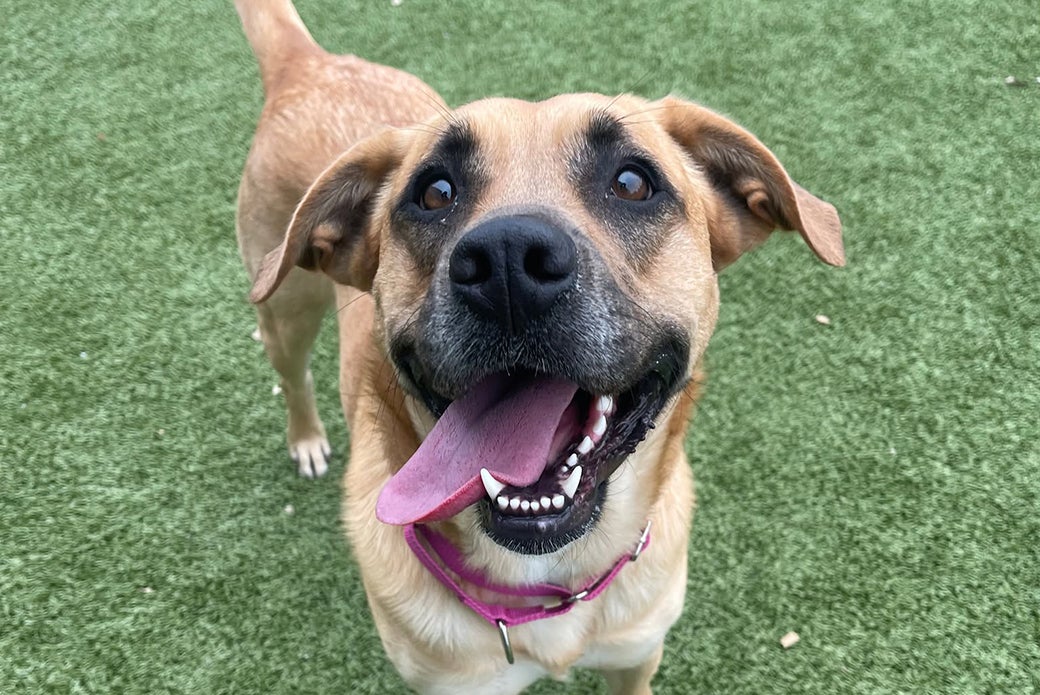 Faith has done well in our doggy playgroups, and she is a fan of bouncy chase games and rough-and-rowdy fun! She will need a one-on-one introduction to any potential dog siblings in the home. She has also previously coexisted peacefully with cats in a foster home. Faith is working on her leash manners, but she is eager to learn and would thrive with an understanding adopter. She already knows “sit,” “down” and “touch,” and training with her is fun for everyone thanks to her love of treats. As a bonus, Faith is always ready for car rides and will happily hop into the back seat!