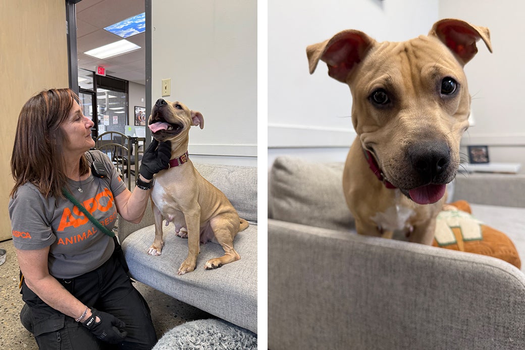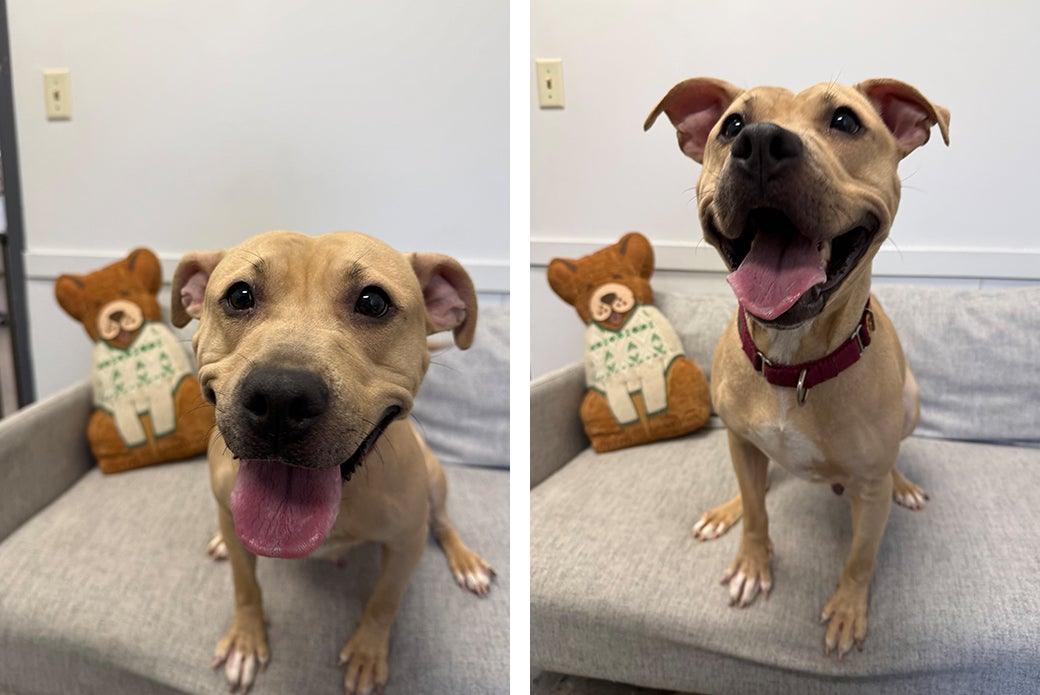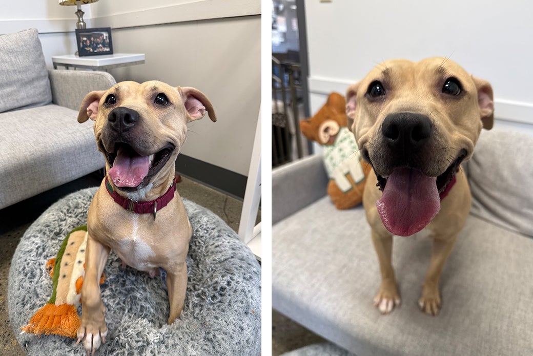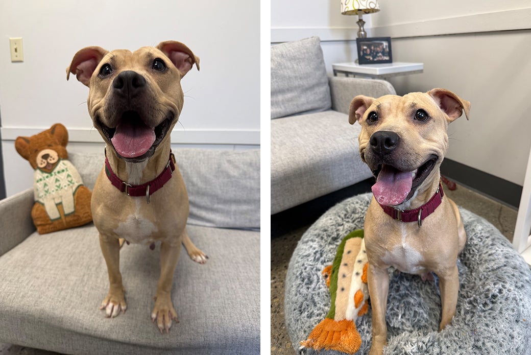 Meet Gucci, a 3-year-old, tan-and-white pittie girl who is equally silly, social and snuggly once she knows you! She loves carrying toys around like prized possessions and will happily parade them from room to room. If there are multiple toys out, she’ll take her time picking just the right one, like it’s an important decision every time.