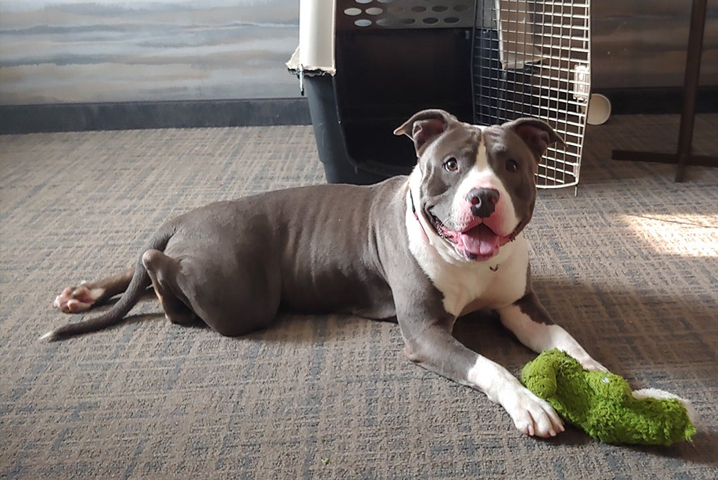 Minnie is a huge fan of toys and plays well independently. She can often be seen throwing her toys into the air for herself. In fact, she loves toys so much it can be hard for her to contain her excitement. Minnie would benefit from an adopter willing to continue work with on waiting and impulse control. Minnie has done well with other dogs, but a meet-and-greet with any potential canine siblings is required before adoption. Minnie brightens any room she enters and would make an excellent companion to adventure with.