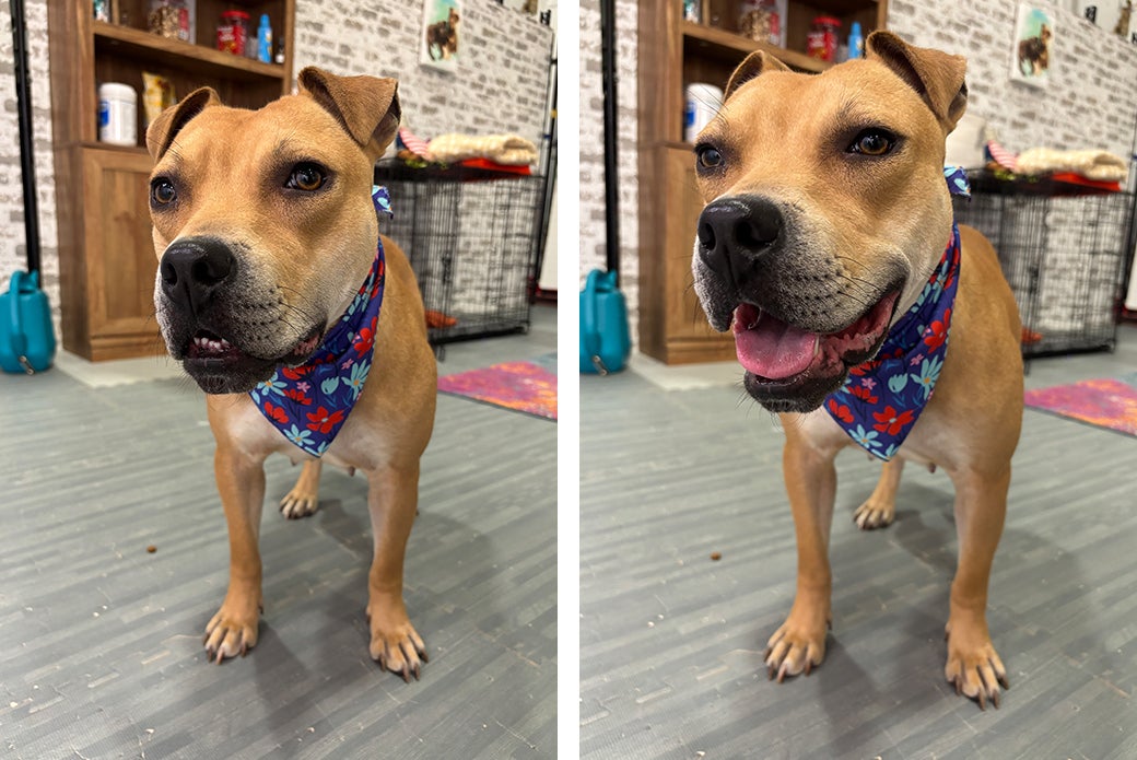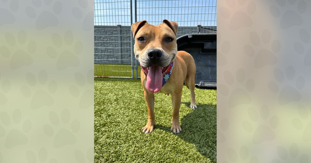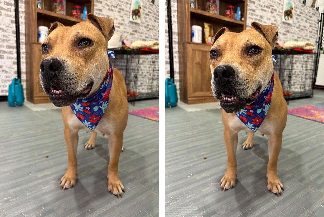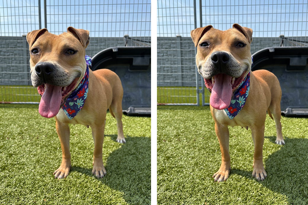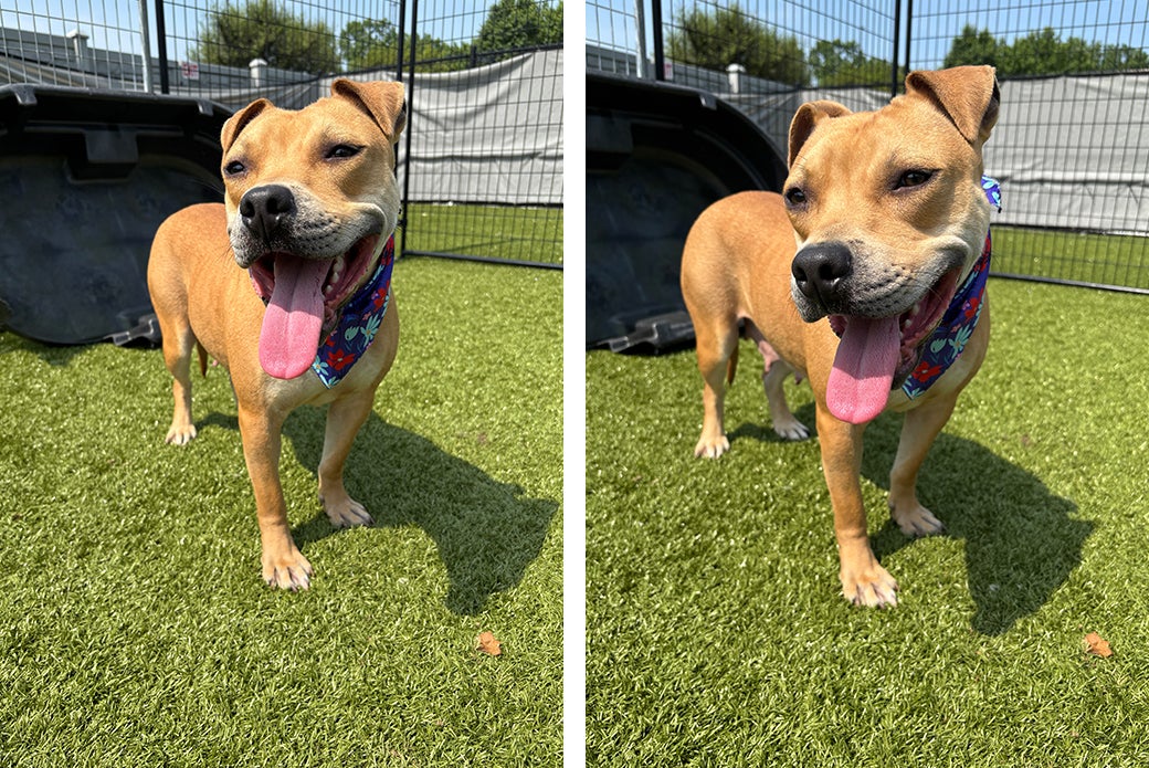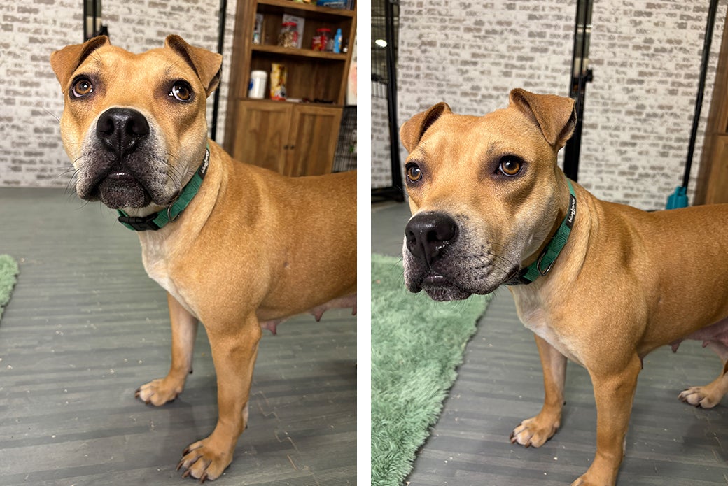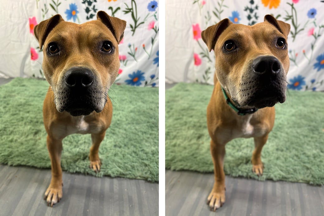 This relaxed mama dog came to us after raising a litter of pups with gentle care — and now it’s Whitney’s turn to be doted on! She enjoys calm strolls, rolling in the grass and sniffing her way through the world. She walks beautifully on a leash with only occasional mild pulling.