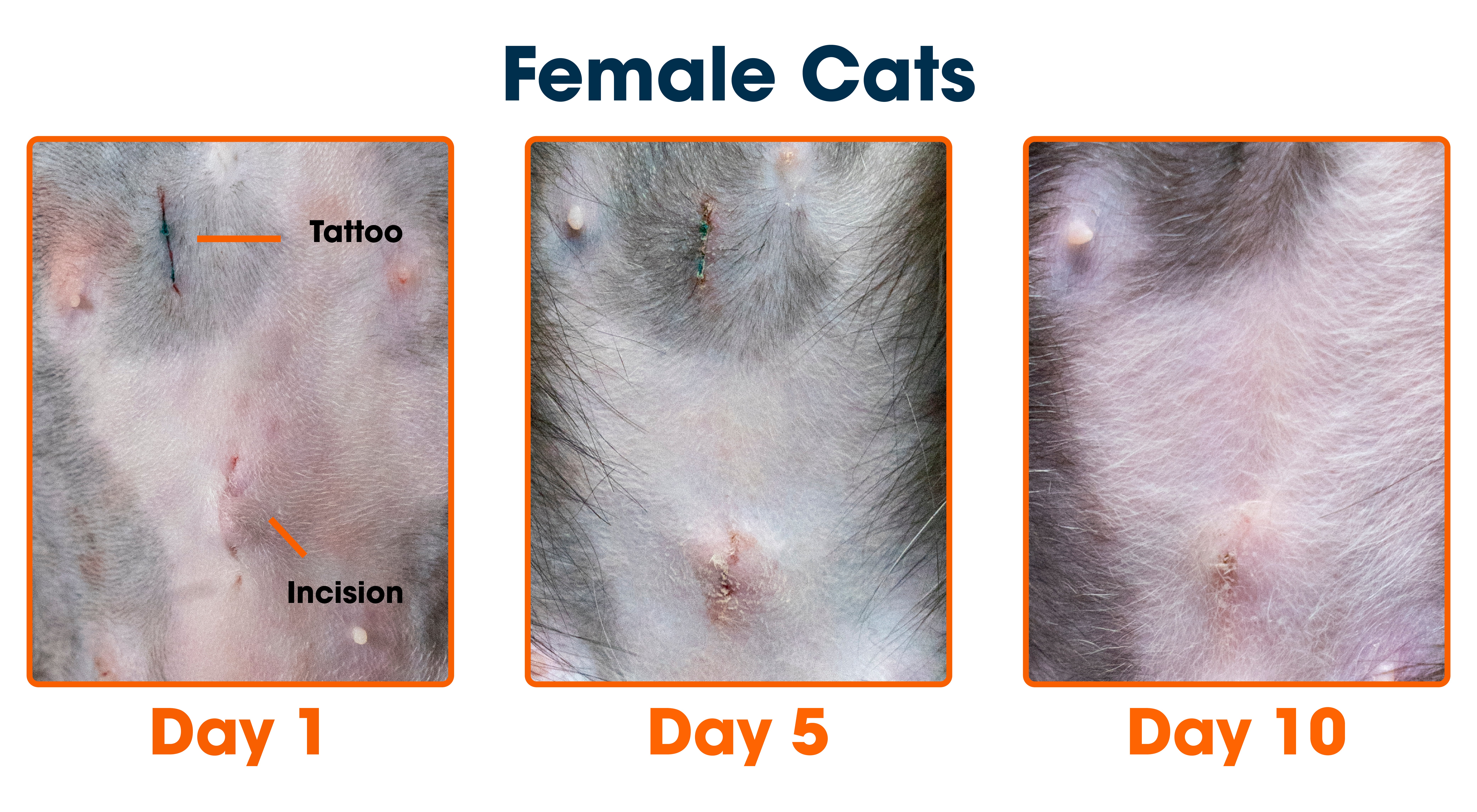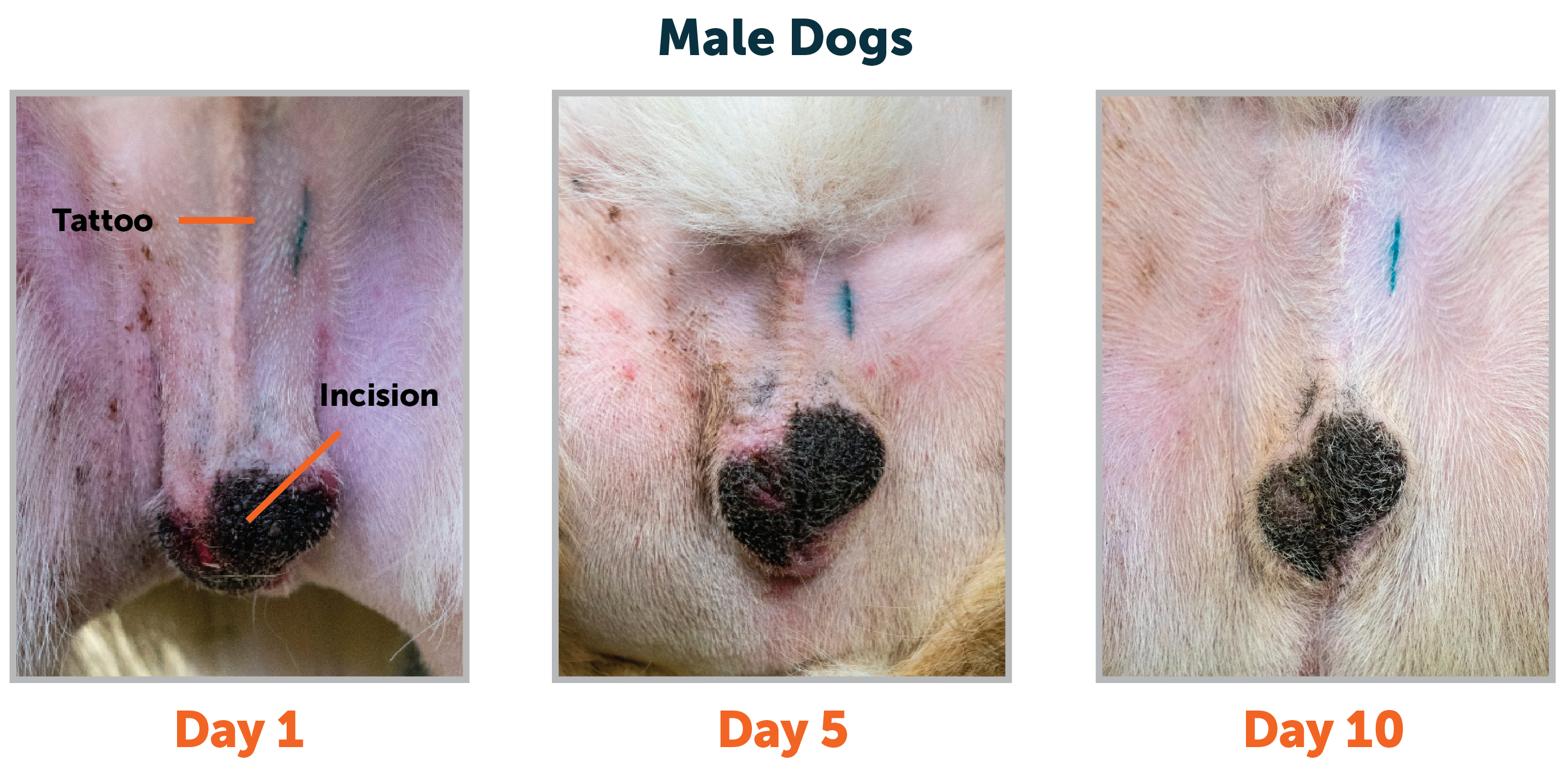 Female dogs and cats have a mid-line incision in their abdomen. Male dogs have an incision on the scrotum, and male cats have two incisions, one on each side of the scrotum. Check these incision sites at least twice daily. What you see when we discharge your pet is what we consider normal.