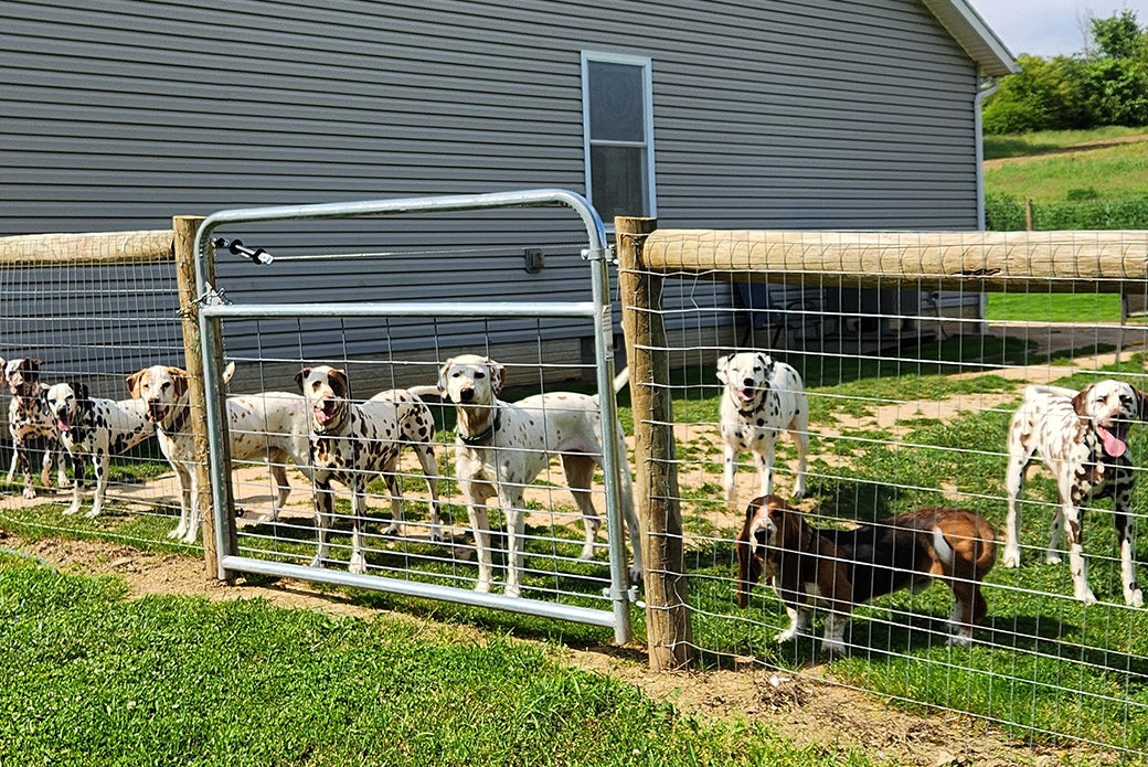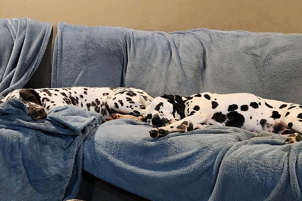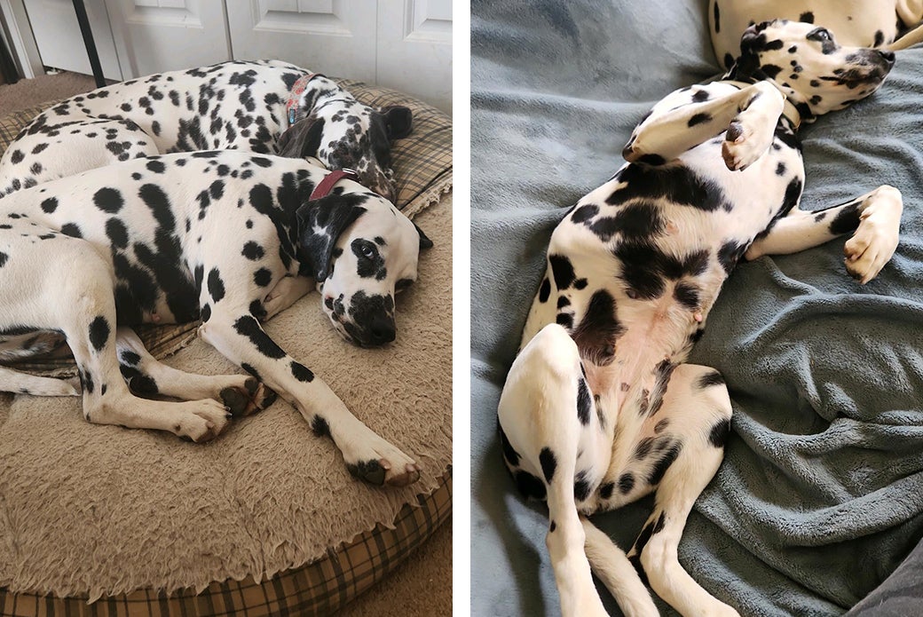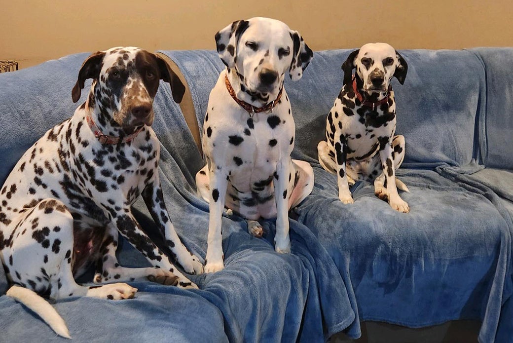 Perdita joined Kelly’s six Dalmatians — Gunner, Hershey, Ember, Bandit, Mr. Butters and Poppy — at the end of August. Kelly renamed Perdita “Blue,” for her one blue eye, and has since adopted Norman, a Bassett Hound, bringing her pack number to eight.