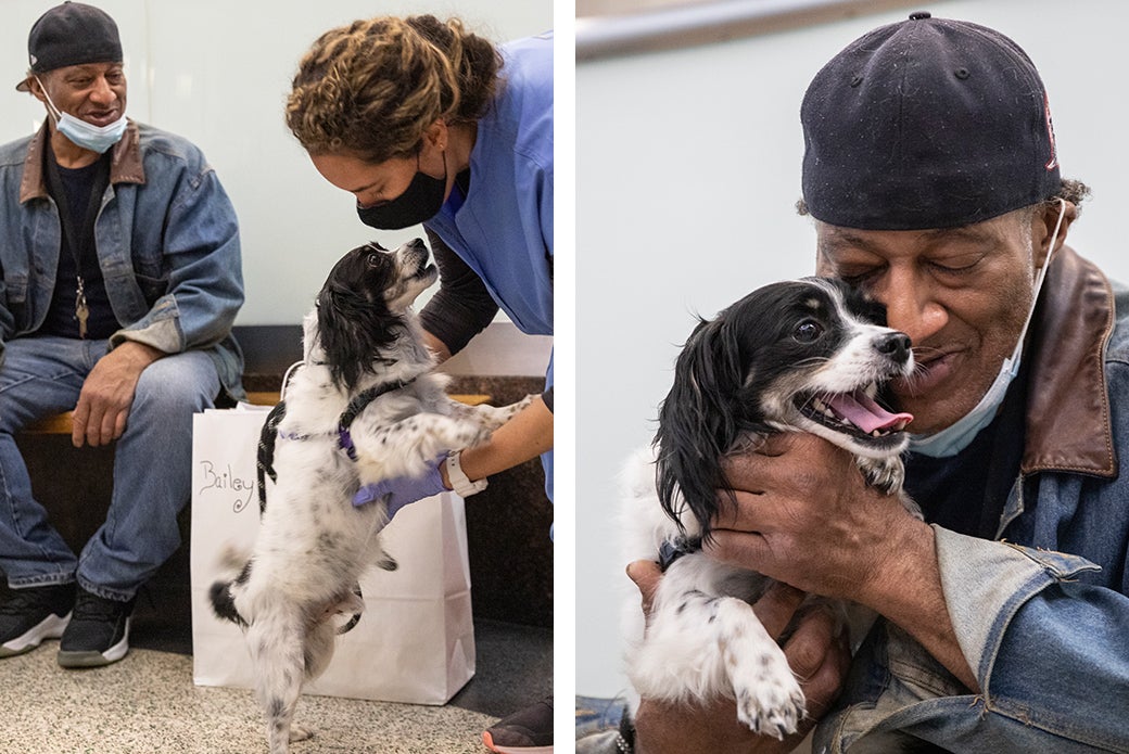 Bailey and his family were reunited on May 19 in the lobby of the ASPCA Adoption Center. To ensure a smooth transition, Sara Xing Eisenberg, Behavior Coordinator, first re-introduced Pepper and Bailey on an outdoor terrace.