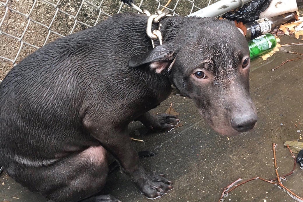 “The dog was freezing, shaking and crying, tethered to the fence with a thick chain and a rope so short he was forced to sit in a puddle,” recalls Officer Pascale. “When I saw him, I thought to myself, ‘Who could do this?’ Then I said to myself, ‘I have to help.’ I jumped out before the patrol car even stopped. I knew I had to get him out of there.”
