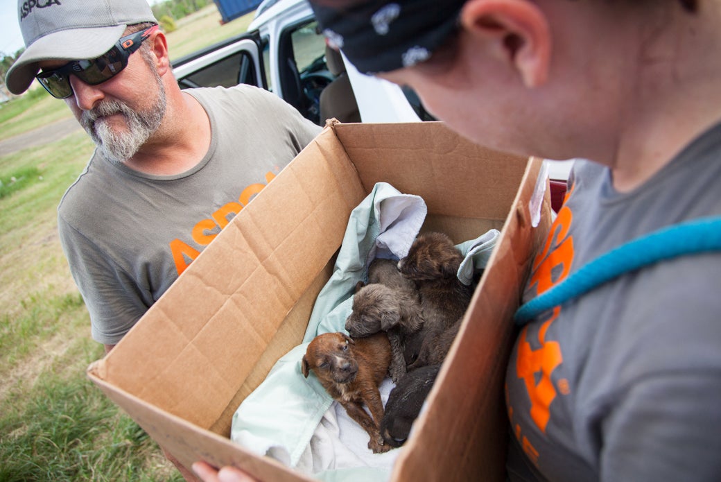 ASPCA volunteers carrying a box with puppies inside