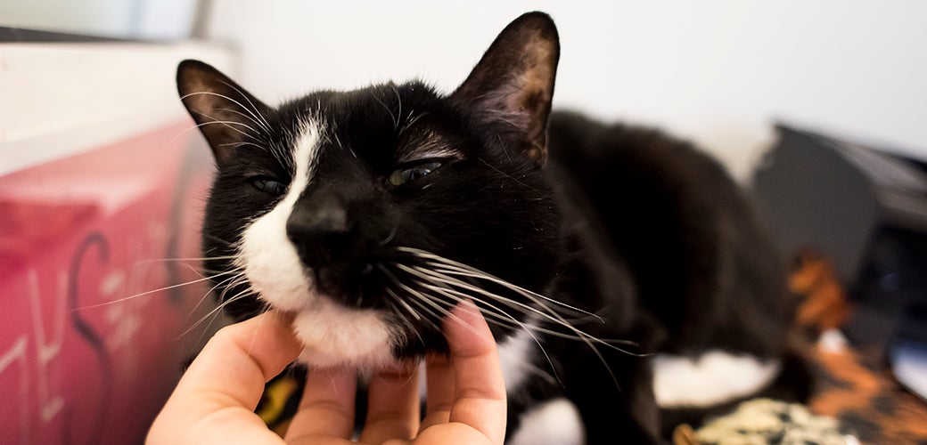 The ASPCA’s Office Foster program was designed to give under- or un-socialized cats like Froggy the chance to live in the office of an ASPCA staffer. Through this program, fearful animals learn to interact with new people while experiencing a domestic living environment, and just as we had hoped, it helped Froggy come out of his shell. By mid-March, the once-reticent cat had even grown to like quiet, gentle attention!