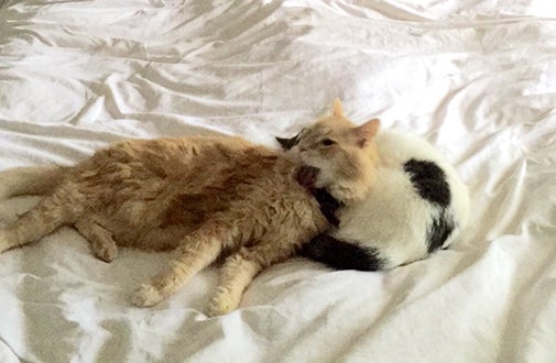 Already pet-parents to a three-year-old cat named Mercutio, Crystal and Will were eager to adopt a second furry friend. During our annual “Clear the Shelters” event, Will came by the ASPCA Adoption Center to meet our adoptable cats, knowing that Crystal had her heart set on a sister for Mercutio. “Our vet told us we should get a cat a little younger than Mercutio to make him more active, but Will fell in love with Ecuador,” Crystal says. “Although she is actually seven, it didn’t matter—Will sent me a photo of her and I loved the single dark grey tear in her left eye.” Further moved by Ecuador’s sweet disposition and “candle tail,” the couple agreed that she was the cat for them. They adopted her that day and changed her name to Sirona Moon, or Moona for short.