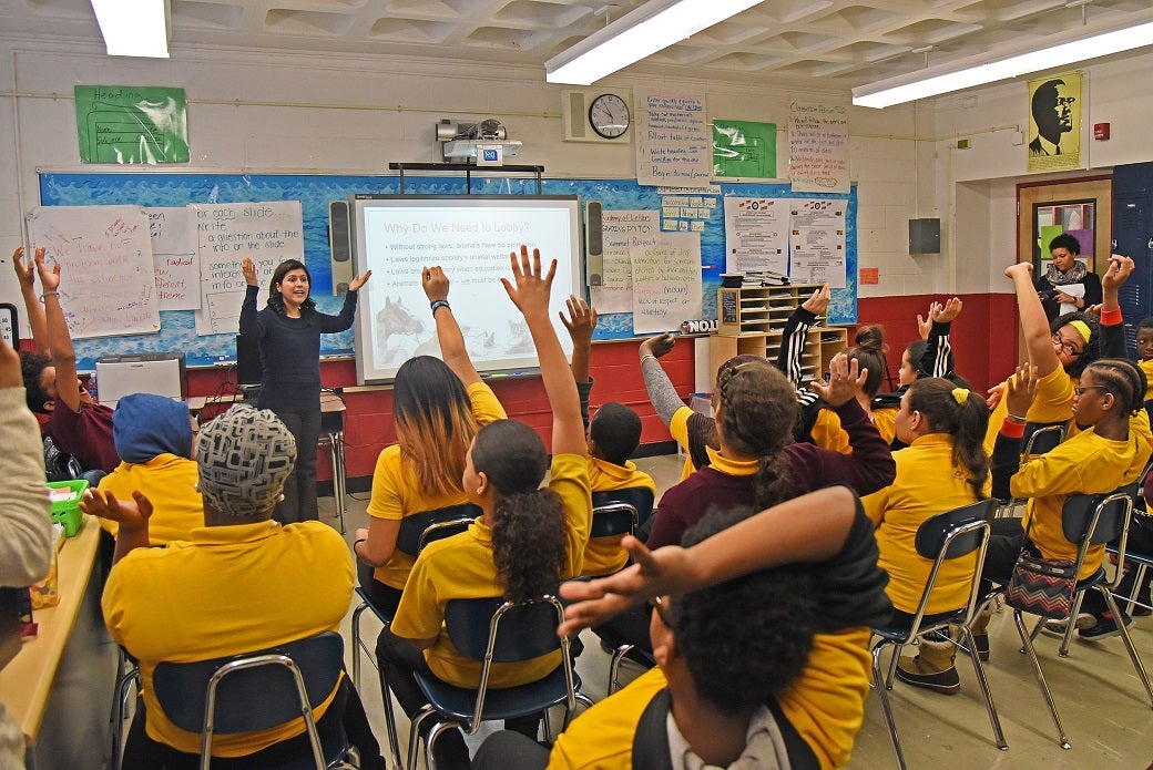 The ASPCA’s Michelle Villagomez encourages students to become animal advocates.