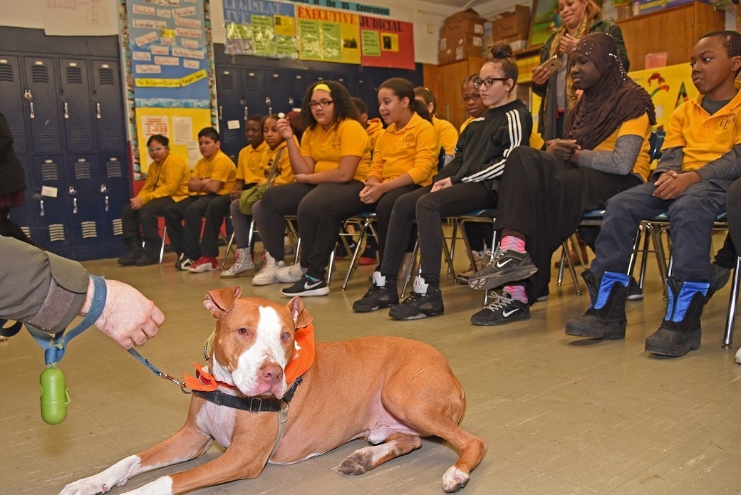 Dani, a therapy dog-in-training at the ASPCA who was rescued by the NYPD, circles the classroom for a meet-and-greet with students.