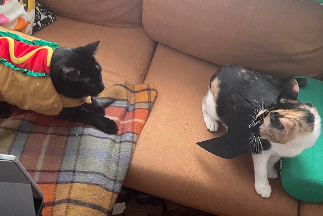 Now, four months after adoption, life with two cats is “really good.” Belarus and Aurora get along great and Aurora only ventures to the bathroom at feeding time. The sisters even donned Halloween costumes together!