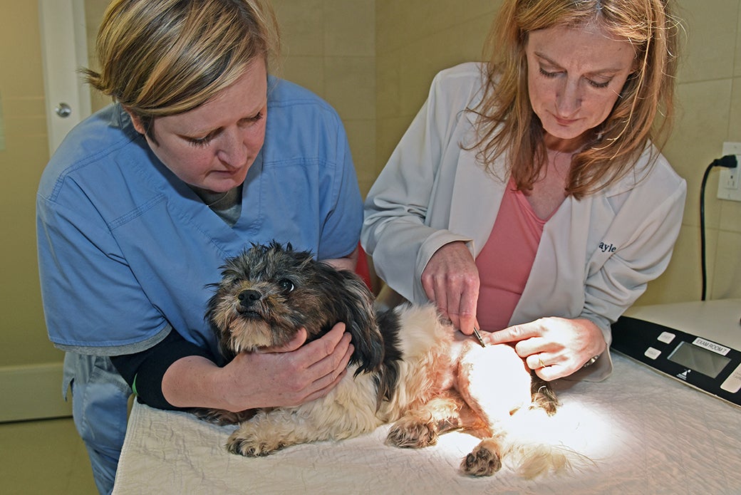 Dr. Gayle removes Bella’s staples while Senior Veterinary Technician Jennifer Doyle assists during a follow-up appointment.