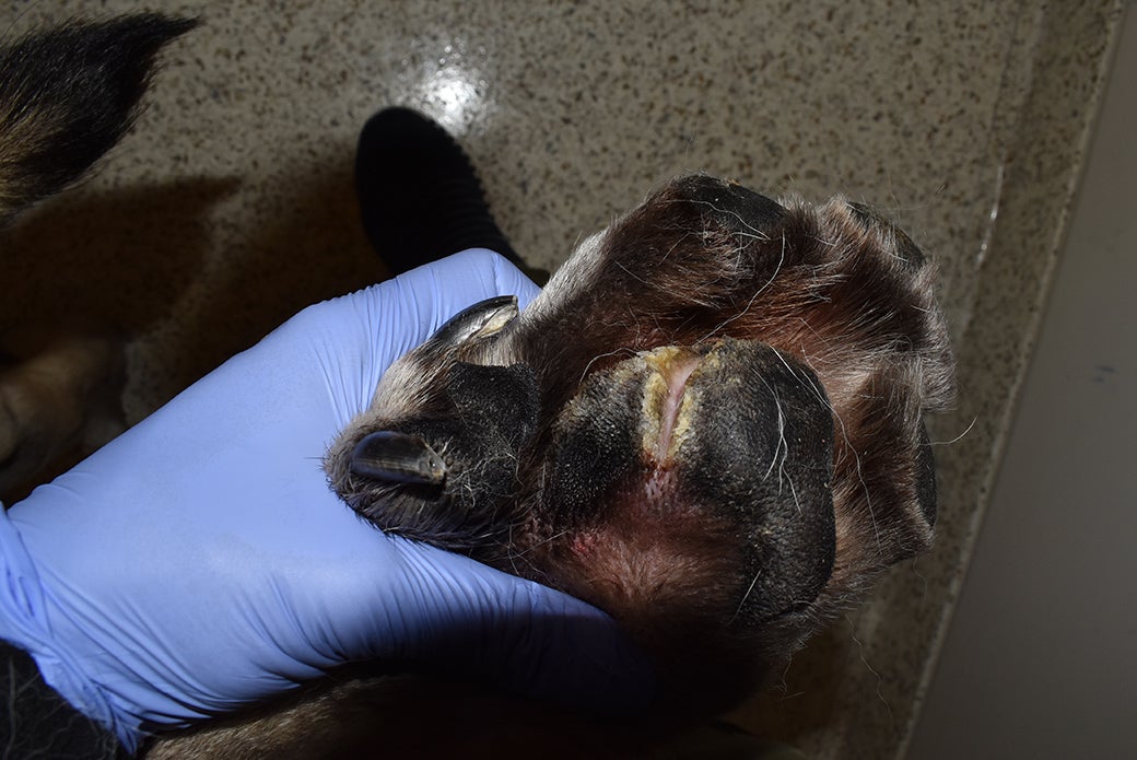 He was underweight and had deep wounds in two of his paw pads.
