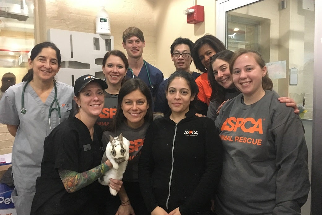 The ASPCA’s bunny intake team included, back row, left to right: Dr. Lori Bierbrier, Theresa Harris, Dr. Michael Lund, Dr. Ralph Tran, Ahsaki Benion, and Jessica Sweeney. Front row: Amie Saladis (with Caramel), Dara Ruiz, Isadora Peraza-Martinez, and Brittany Lambur.