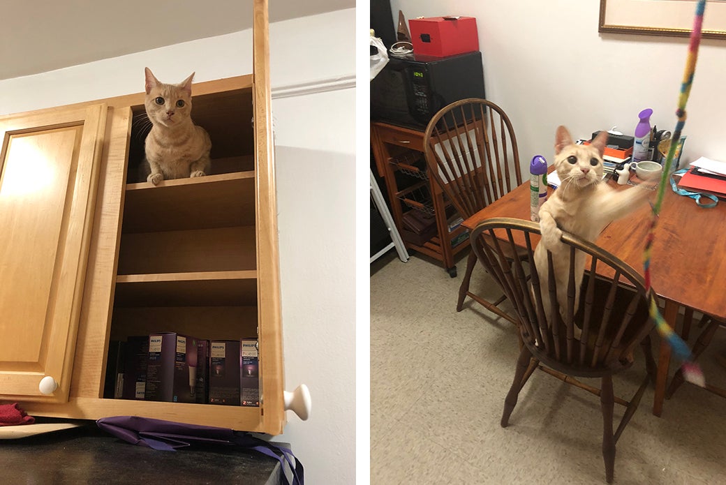 “Now he prances, runs around and lies down all over the place knowing that he is basically the king of the castle,” says Chris. “If I make a sandwich or a meal, he's quick to jump on top of the refrigerator or garbage can to make sure he knows exactly what's going on.”
