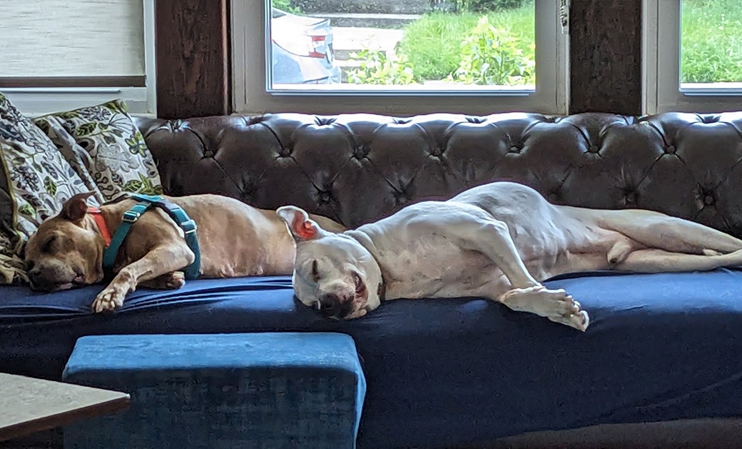 “After our 14-year-old pit bull, Monty, died in May, our remaining dog, Petey, was so sad and dejected,” says Nick Stefanik, a project manager for the Columbus Downtown Development Corporation. “I looked online for pit bulls in our area, and Dumplin was one of the first I saw. Her description said she’s laid back and a couch potato who loves to cuddle and that’s exactly what we were looking for—a second dog for Petey to cuddle with.”