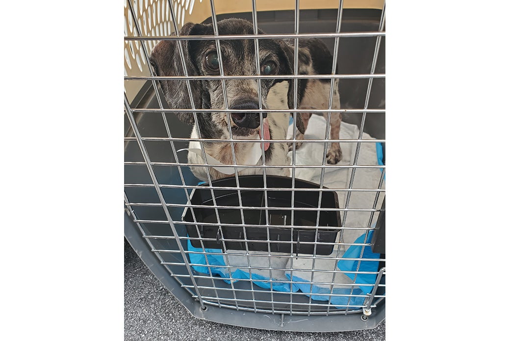 As Kat peered into one dog’s crate, a 12-year-old Dachshund named Freckles peered back.