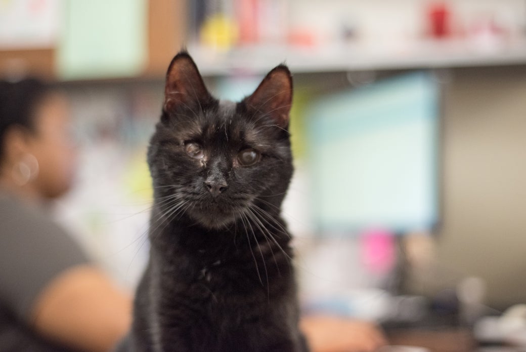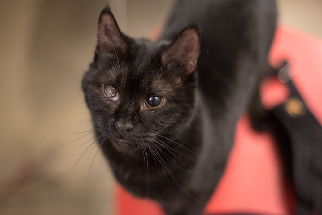 Five-year-old Jules came to the ASPCA in January 2016, after being rescued from a tragic situation along with many other animals. Upon arrival, Jules and her companions were admitted to the ASPCA Animal Hospital (AAH), where they were able to receive veterinary care and begin to heal. It was noted that Jules had some scarring on her left eye that veterinarians believed was probably from a previous eye infection. Luckily, for the pretty black cat, the scarring didn’t hinder Jules’ eyesight in any way.