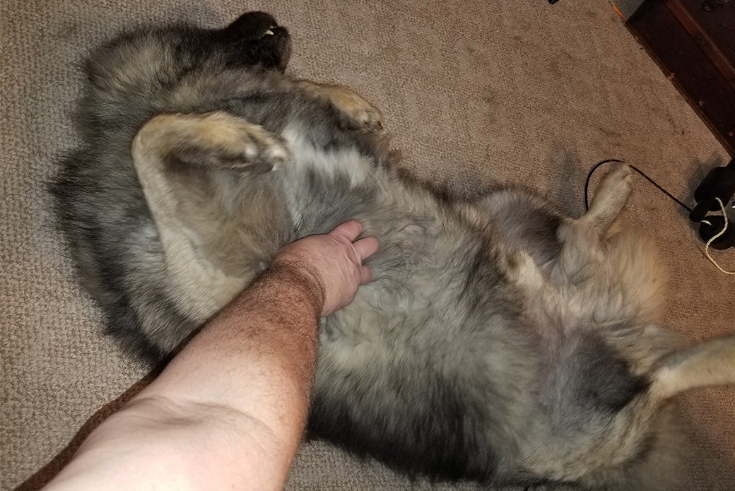 “He rolls over and exposes his belly or he puts his head on us and lets us rub his head,” says Rick.