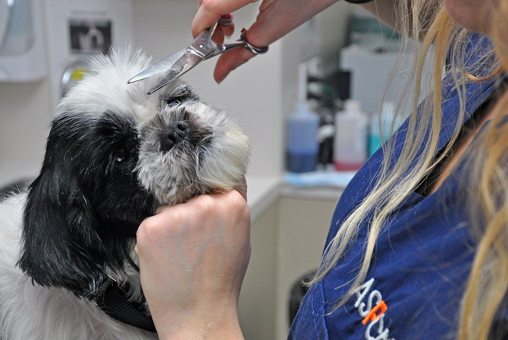 While it’s safe to lightly trim your pet’s hair, we advise that you NEVER shave your pet. When trimming at home, trim dry, clean fur around the face, feet and tail. Be very careful with your scissors and when trimming around the ears, use your free hand to hold the ear to make sure you only trim the excess fur.