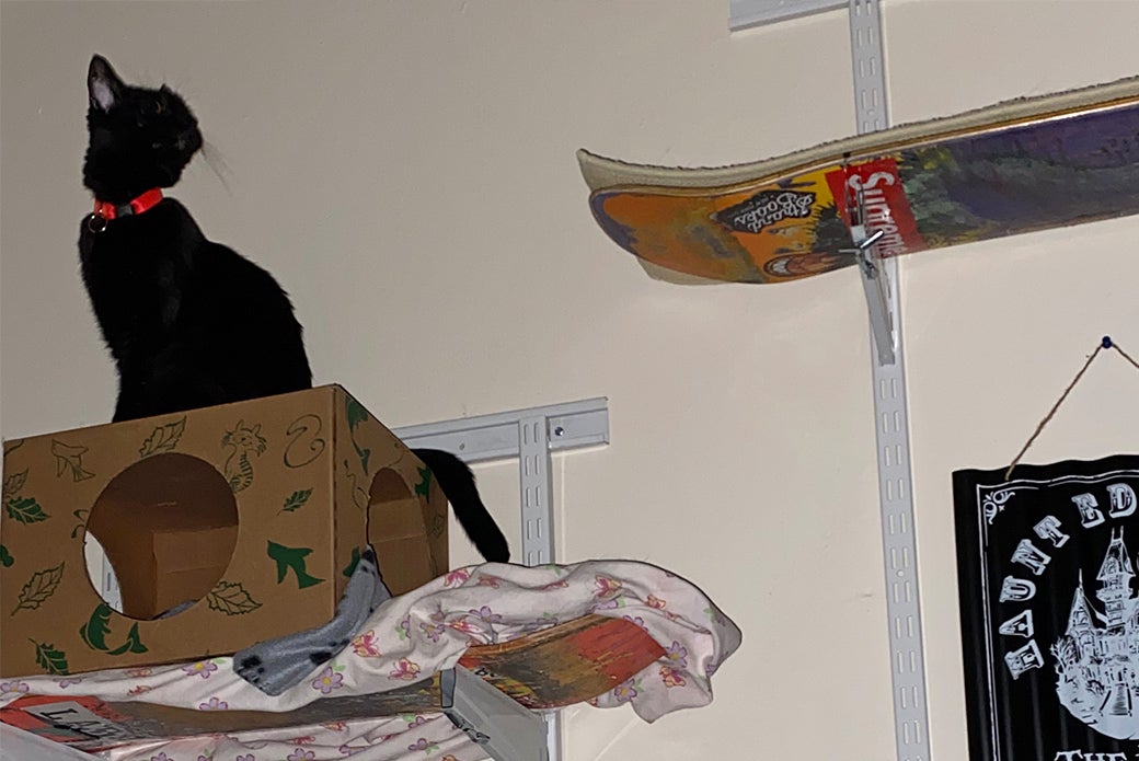 Larissa slowly introduced her roommates to the pair, as well as the resident cat, Osito. Larissa’s father modeled her skateboards into shelves on her wall so the cats could perch on them. Both cats love gazing out the windows.