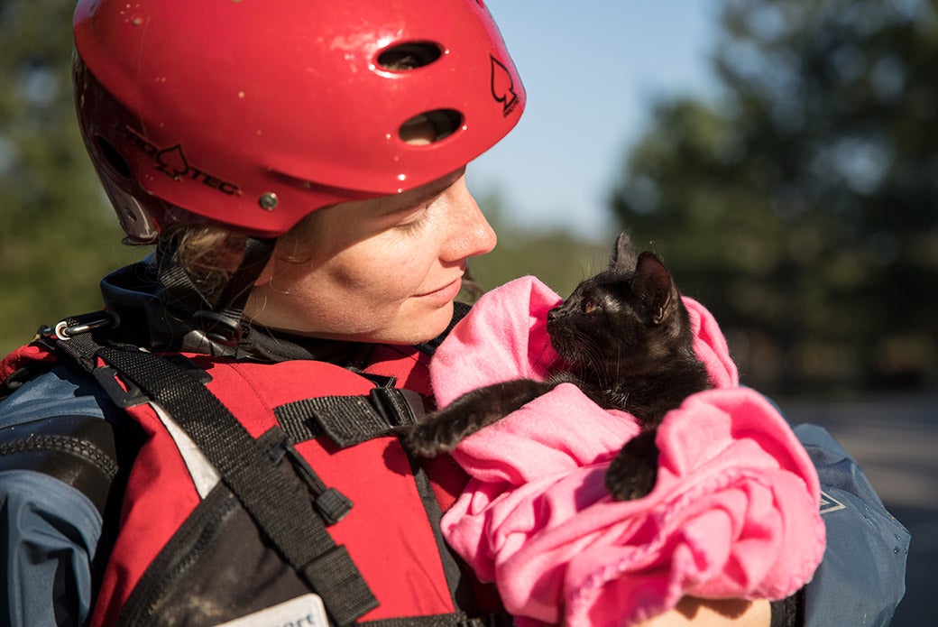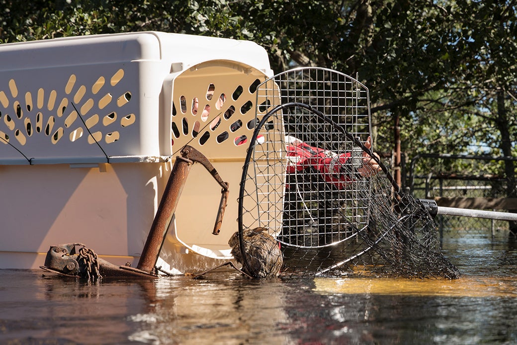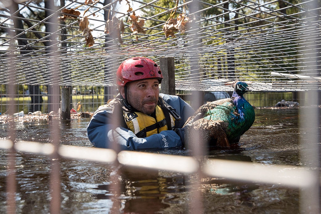 Our responders search flooded areas for animals, rescuing several dogs, cats, chickens, peacocks and a rabbit: