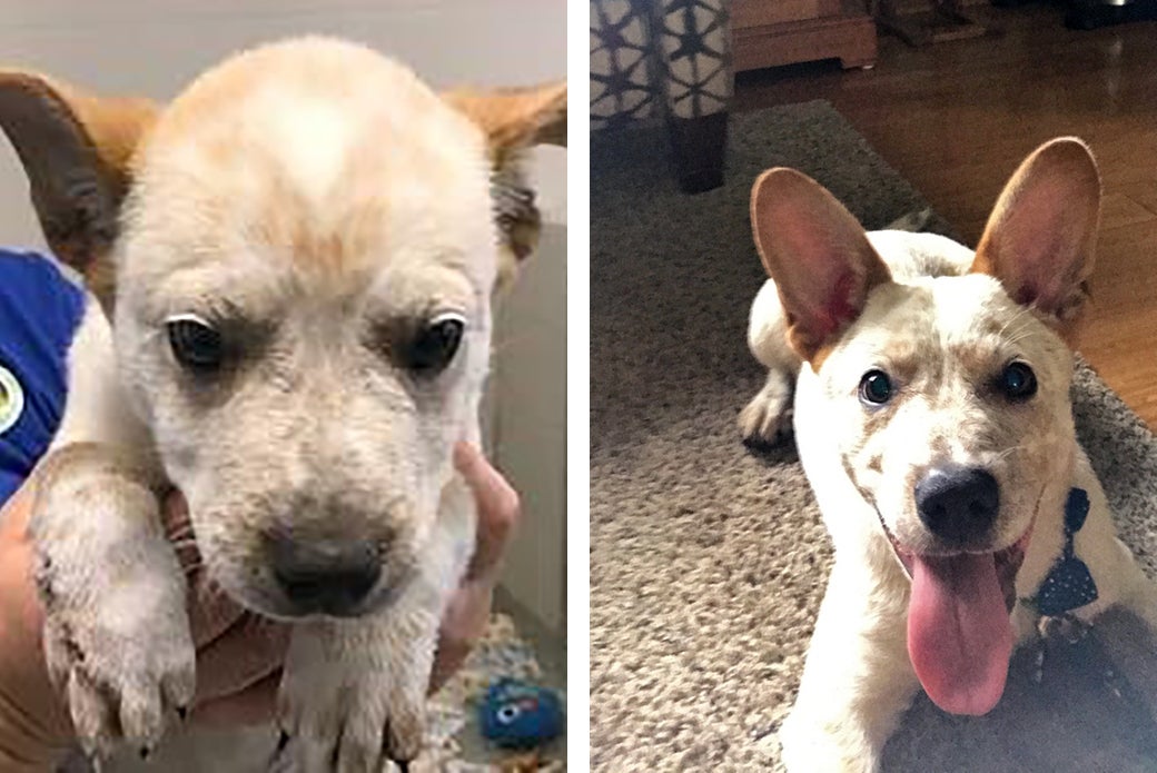 Left: Finley after he was first found injured. Right: In Iowa, happy and healed!