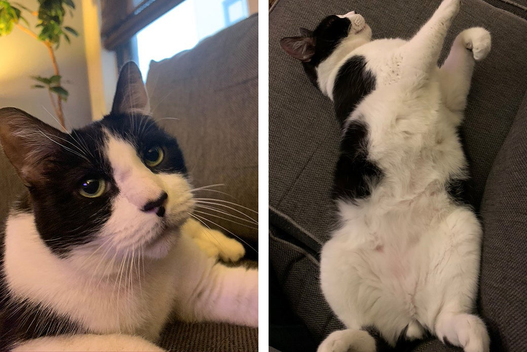 “He greets me with a couple of meows, then throws himself down and flops back and forth,” Matt explains. “We might spend the evening playing with a mouse on a string. Sometimes he’ll stare at a cat across the courtyard in another apartment. He usually falls asleep on couch.”