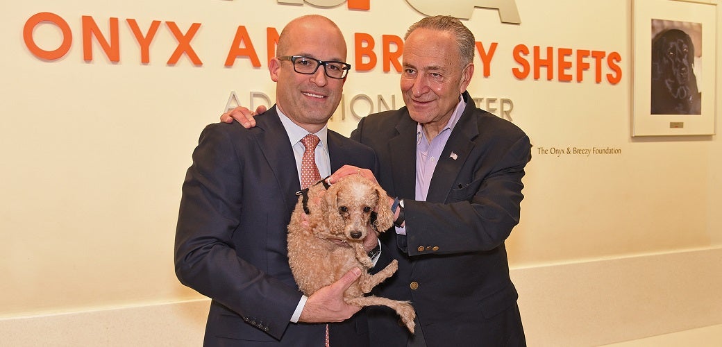 ASPCA President and CEO Matt Bershadker with Senator Chuck Schumer (D-NY) and Kirby, a Poodle-mix available for adoption at the ASPCA.