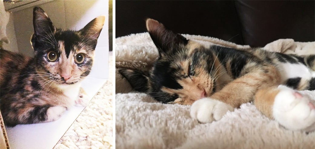 Ashley W. had just moved to New York when her roommate suggested that bringing a furry friend into their apartment could be the perfect thing to help Ashley transition into the city. The pair began to think of what kind of cat would be the perfect addition to their home, and they decided to adopt a rescue kitten. Ashley felt like she would prefer an orange kitty, while her roommate Nicole thought she’d like a black cat. When Ashley finally went into the Adoption Center, she saw Roxy—with her orange and black spots—and she knew it had to be fate.