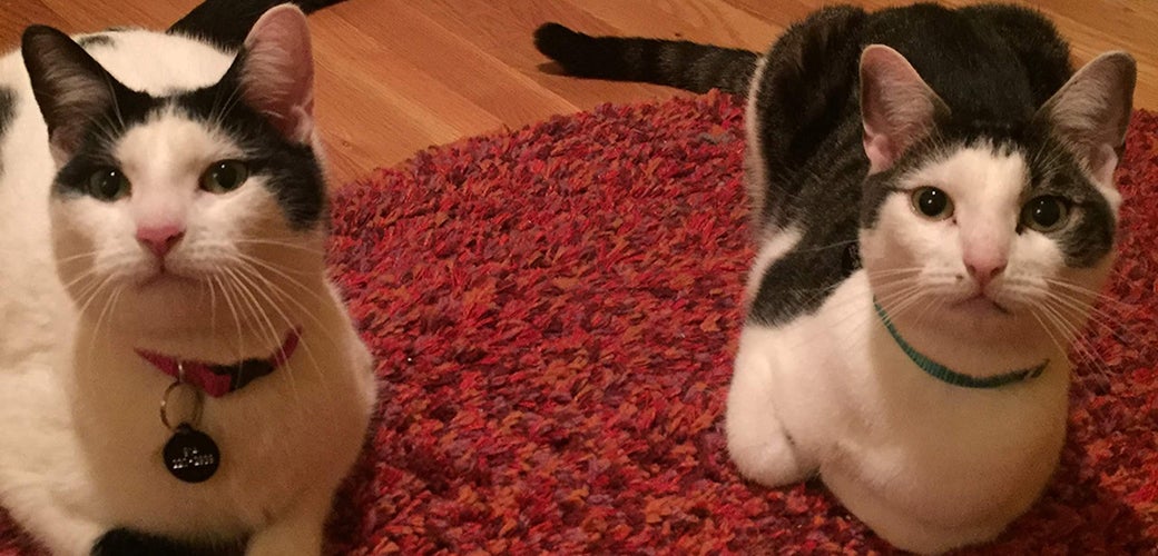 “I had initially gone into the Adoption Center to look at a couple kittens, but I kept thinking about the black and white cats I saw,” Juliet recalls. “They were just so cute and seemed so curious. And they kept doing things that made me laugh—at one-point one of them went over and laid down literally on top of other.”