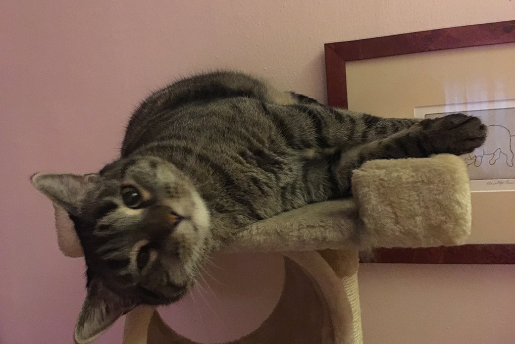 “Pancake runs up and down my apartment, and leaps on and off my sofas,” says Heather. “We also play with her laser pointer given to us by the ASPCA and a hanging fish toy. Pancake loves to capture the fish in the air and spin around.”