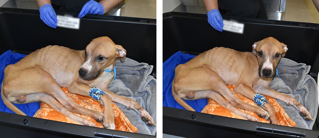 “It was especially challenging for his case, since we usually use a lot of treats to get an animal to enjoy physical therapy, however Sonny was on a refeeding plan, which is something we use for any starved dog,” Dr. Crowley explains. “This plan restricts the number of calories a dog gets each day for the first two weeks of reintroducing them to food to prevent something called refeeding syndrome.”