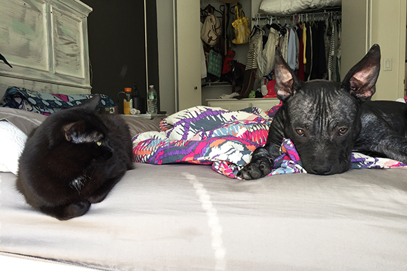 Though his health was on the mend, Waffles’ skin was patchy and he had not yet been housetrained. He also displayed signs of fear and anxiety, but we were hopeful that the right adopter would come along and see his potential. Fortunately, in March, Katharine F. and her girlfriend walked through our door.