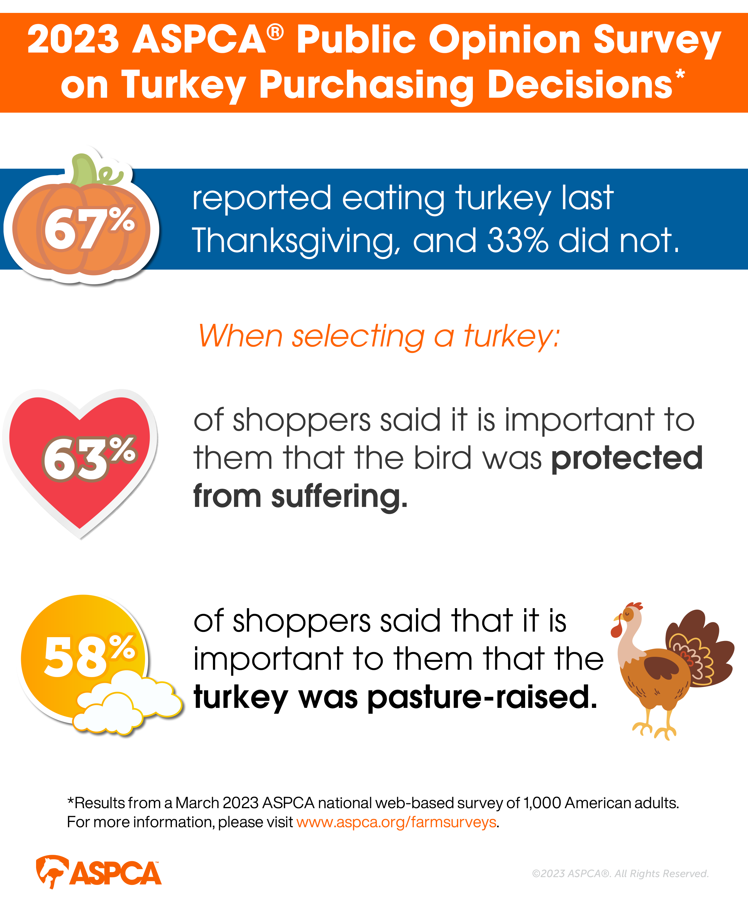Survey data show that over half (56%) of Americans say it’s important to them that the turkeys they buy are pasture-raised ... but less than one-third (28%) of Americans reported being certain that the turkey they ate last Thanksgiving came from a farm where the birds had any access to the outdoors. The reality is, the vast majority of turkeys are raised entirely indoors in crowded warehouses, regardless of the pretty pictures on the package. To find the higher-welfare options on the look for brands that have two or three green hearts on our Shop With Your Heart Grocery List! For more options, see our certified farms by state list (number 3 below) or variety of plant-based alternatives (number 4 below).