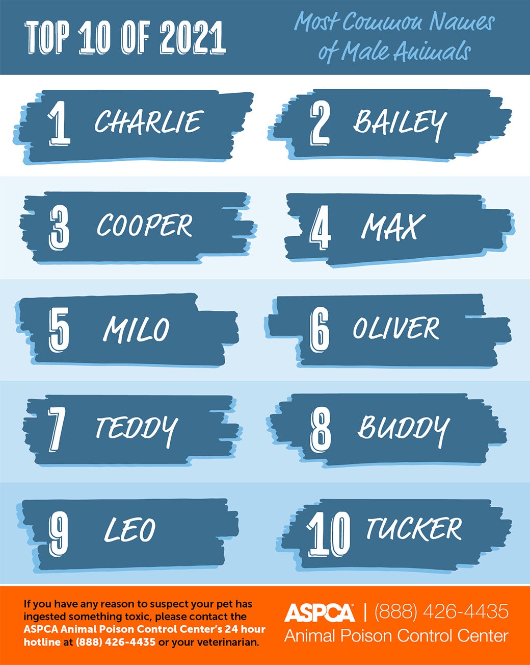 In 2021, our veterinarians at the ASPCA Animal Poison Control Center (APCC) helped over 401,550 animals. For each call, a record was kept, including the pet’s name, and at the end of 2021, APCC created two lists of the top 10 male and top 10 female pet names they received calls about. Check the lists to see if your pet’s name made it!