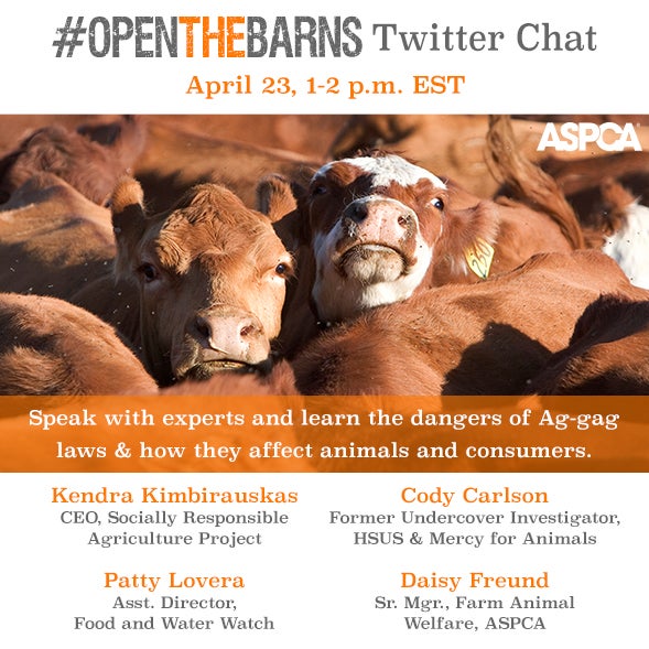 If you want to know how ag-gag laws affect animals and consumers like you, join us and our panel of experts for our #OpenTheBarns Twitter chat on Thursday, April 23 from 1:00 to 2:00 P.M. ET to have your questions answered. Just follow the hashtag #OpenTheBarns and include it in your tweeted questions to have them answered!