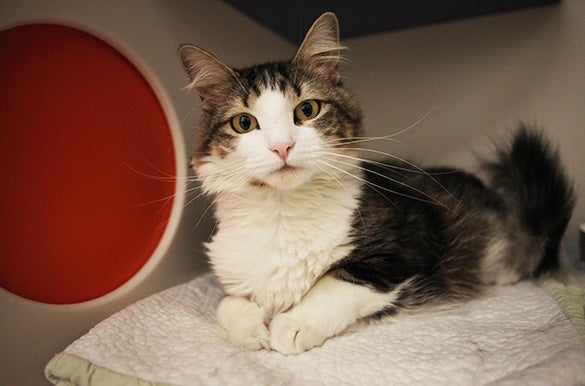 A wide-eyed wonder cat, Glenys is a gentle and furry four-year-old girl who enjoys being loved up with soft pets and head scratches. She has three legs, but doesn’t let that stop her at all from careful exploring, jumping up on chairs, batting around toy mice and using her scratching post. When new people come into the office, Glenys will often walk over, train her big yellow eyes on them, and offer her silky head as if to say, “I love you. Please pet me.” Sometimes when she’s alone, Glenys will let out a little meow to ask for company, but in a very sweet way. She loves soft beds, particularly the little cubby in her foster home—it’s her bedroom and safe place from which to observe everything going on. She’ll find one in your home, too. Glenys is a calm and sweet cat who would be perfect for anyone who has room in their heart and home—one with no other cats, please—for a very loving pet and loyal friend.