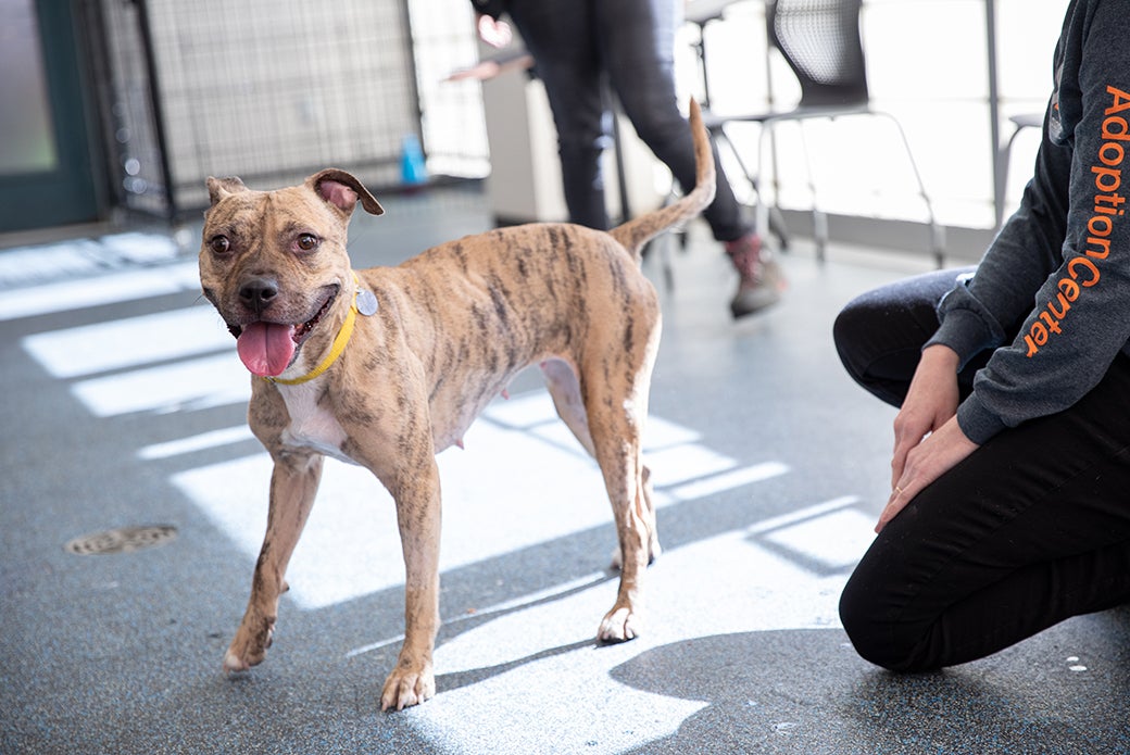 Big fan of: Other dogs! At the Adoption Center, Destiny has been the star of our daily doggy playgroups. She’s had the chance to play with lots of other friends who speak her language and has yet to meet a pup she doesn’t like! So, trips to the dog park post-adoption? Yes, please! With people, Destiny is a bit more hesitant. She takes a little time to warm up to new human friends, but once you’re friends, you’re friends for life! Sneak a few treats in the mix and Destiny is sure to be on the path to love—she just needs a little time to get there!