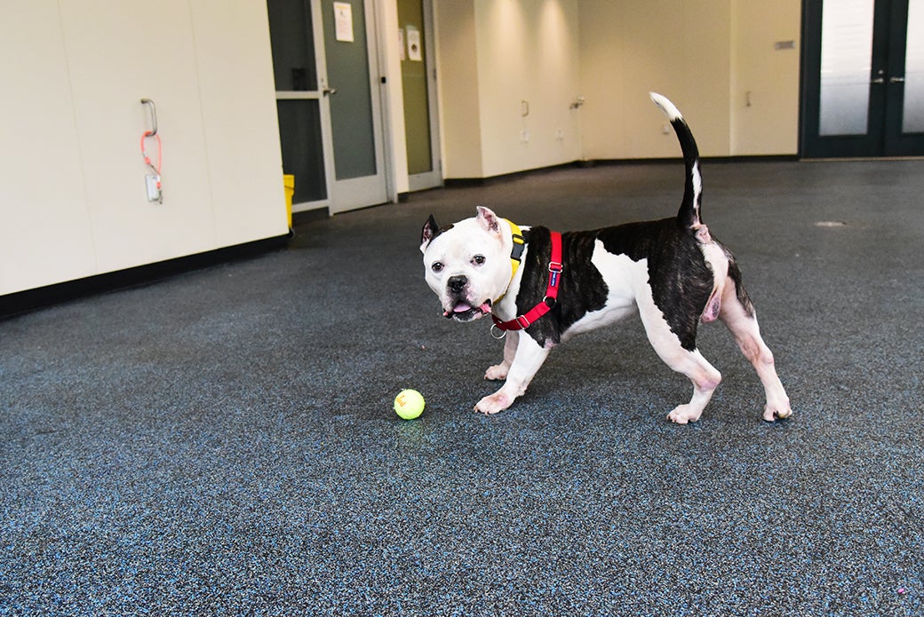 Big fan of: Tennis balls! Mr. Beefy would be in paradise if he got the chance to attend the US Open because he loves nothing more than running after any and every tennis ball he sees. When he doesn’t trot right back over to you with it, Mr. Beefy likes to stretch himself out on the floor and chew to his heart’s content! The only thing that might compete with Mr. Beefy’s love of toys is his love of people. This guy has never met a person he doesn’t like and will happily take all the full-body rubs you’re willing to give! Mr. Beefy is somewhat inexperienced when it comes to meeting other dogs and prefers to focus his attention on just his human friends.