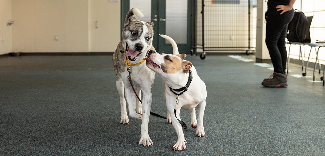 The exception to this is if they try to fight. If the dogs become tense with each other (raised hackles, growling, showing teeth, prolonged stares, snapping, etc.), call the dogs away before things escalate. Try not to pull them away by the leash—added tension on the leash might trigger an attack. If the dogs won’t come away on their own, wave a super yummy treat in front of each dog’s nose and then lure them to turn away from each other. Make sure to keep your body language as relaxed as possible and remember to breathe! Dogs can read tension or anxiety in your body language, and it can affect their interaction negatively. If the two dogs attempt to fight or have a negative interaction, we recommend reaching out to a behavior professional for assistance in any further introductions. Keep the dogs completely separate utilizing crates and/or securely installed gates until you are able to obtain professional guidance.