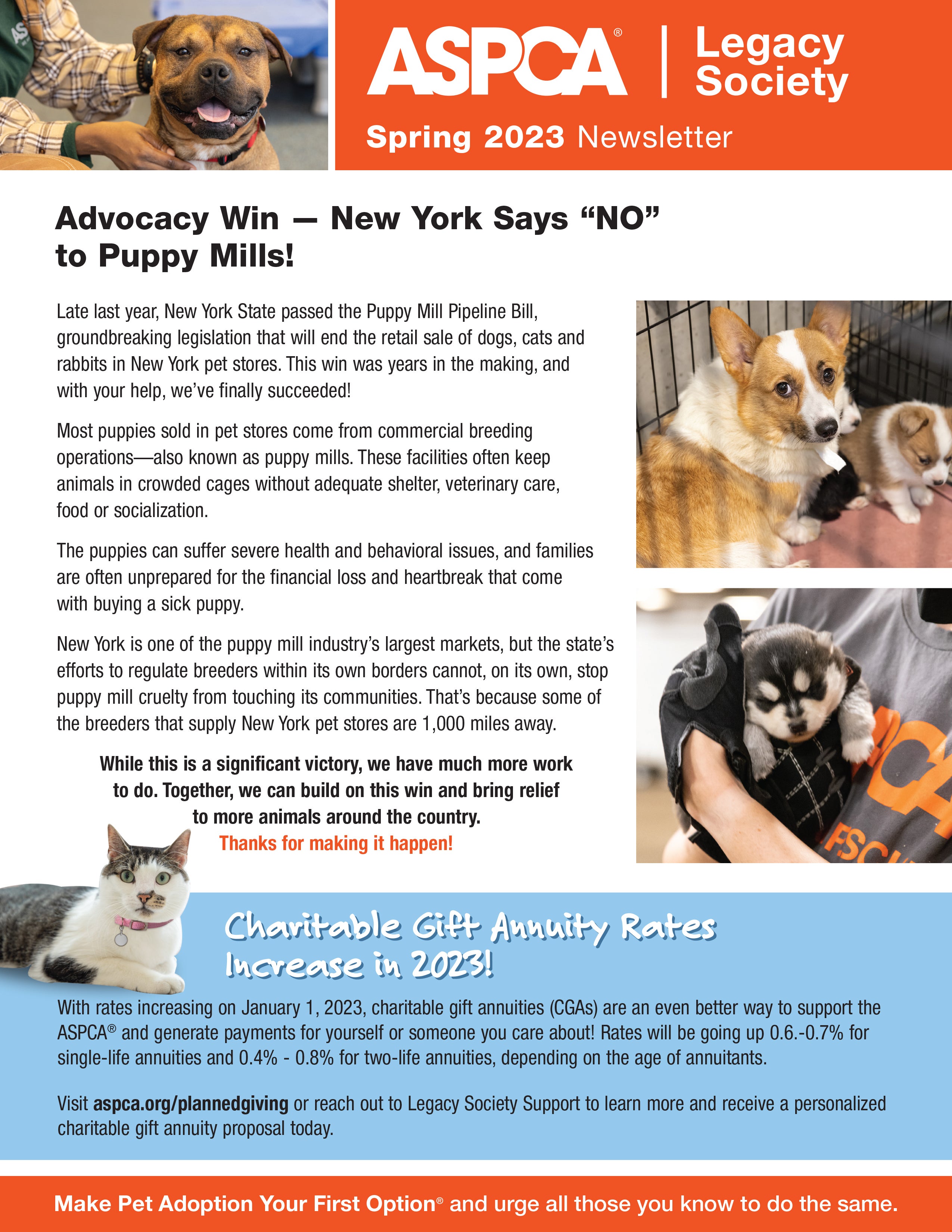 A gift annuity is a contractual agreement in which, in exchange for a minimum gift of $10,000, the ASPCA will make payments to you, another person, or two people for life. Use our calculator to see the benefits of a Charitable Gift Annuity.